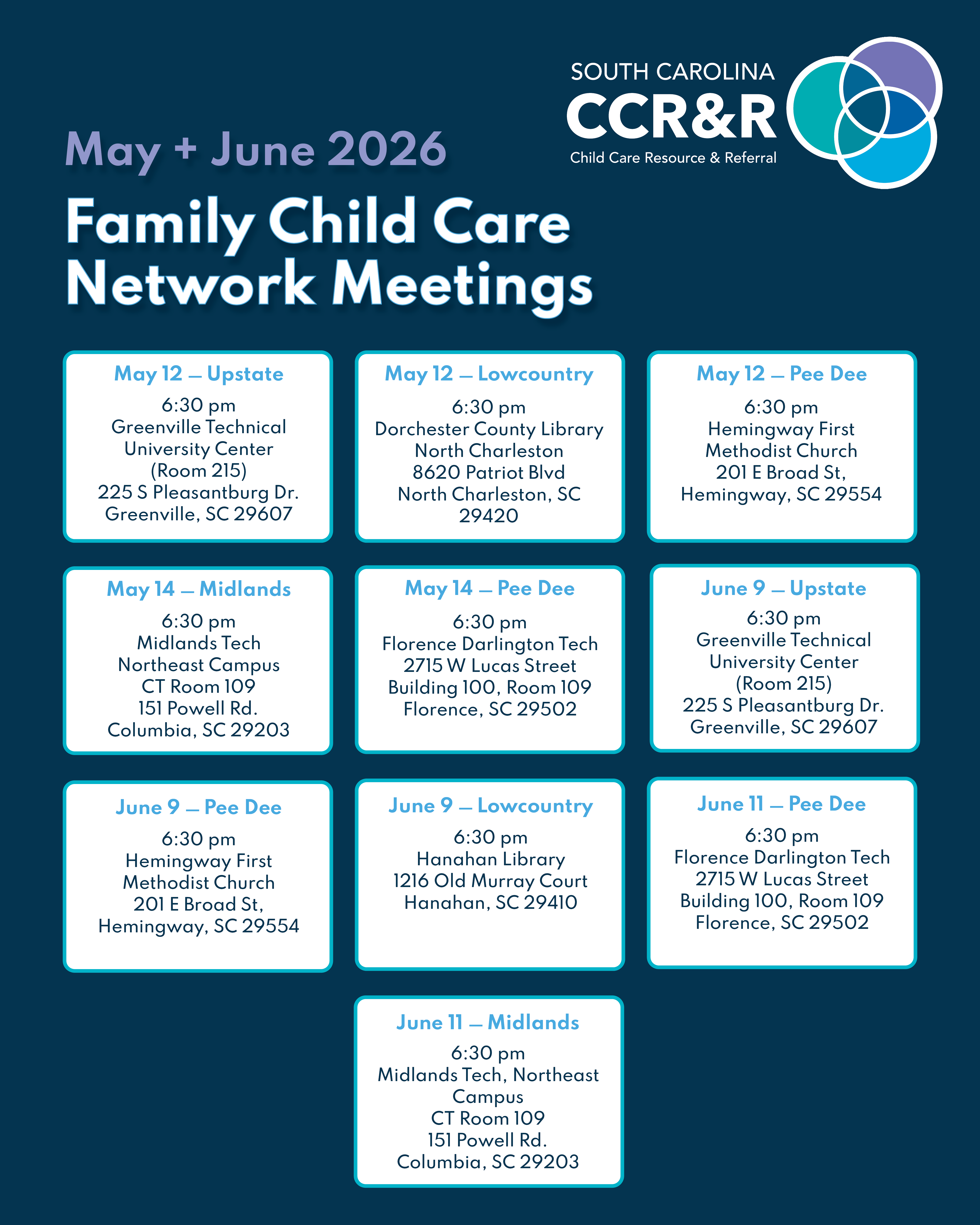In-person meetings will provide FCC professionals with updates on new training and regulations, the opportunity to build relationships with other providers in South Carolina, and time to plan and build their network.